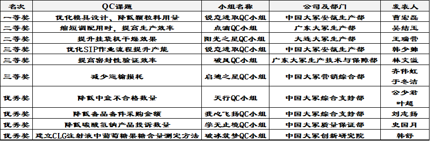 2024年度公司級QC小組活動發表大會活動于6月14日在綜合樓階梯教室順利召開。今年的QC小組活動共收集到來自中國大冢、廣東大冢、大連大冢的38項申報課題,課題數量為歷年來之最,經過課題材料初選、指導、再次審核及綜合預講的現場發表情況,最終甄選出10項課題參與到最終的現場發表階段。獲獎情況如下: